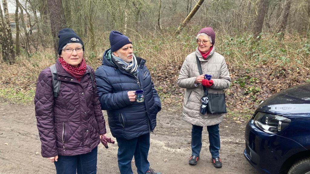 25 Wanderfreunde treffen sich mit Kalle Scheele bei trübem Winterwetter zur Kohlwanderung auf dem Parkplatz der Gildestube, dort ist Start und Ziel.